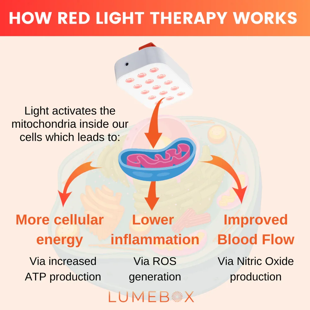 Red light therapy uses specific wavelengths of red and near-infrared light to target our mitochondria (the powerhouse inside our cells) to: